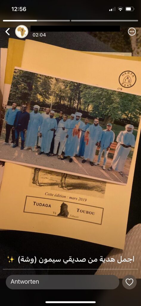 Ein Tubu aus Libyen, den ich vor Jahren in Bardai kennengelernt hatte, hat kürzlich geheiratet. Seine Frau lebt in Frankreich und so hat er mich zur Hochzeit in Nordwestfrankreich eingeladen. Leider habe ich es nicht geschafft, hinzugehen. Dafür wollte ich immerhin ein Geschenk schicken: Die Sprichwortsammlung mit Weisheiten für ihn, ein Rezeptbuch für sie und das Büchlein mit gesammelten Tubu-Namen für ihre gemeinsamen Kindern. Garniert mit einem Hochzeitsfoto das ich auf Social Media gefunden und ausgedruckt hatte. Doch auf der Post kam die erste überraschende Wendung: Ich müsse nochmals umkehren um zuhause ein Zollformular online auszufüllen und mehrfach ausgedruckt mitbringen. Damit sich das Prozedere nicht über Tage hinzog, tat ich das sogleich. Mit etwas weniger Herzblut als in der Widmung der Bücher, deklarierte ich, dass ich mit diesem Versand nicht Umsatz machte und kehrte wieder auf dem Absatz. Bei der Post wurde ich die Sendung, allen Papierkram und einige Franken los. Ich gab das Paket auf, aber nicht die Hoffnung, es würde gut ankommen.