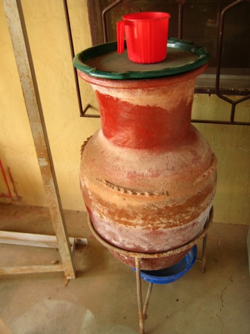 Nach und nach haben wir alles gefunden, „erhandelt“ und bezahlt. Hier eine Bodenmatte, dort zwei Matratzen, da zwei Plastikbecken. Auch einen tschadischen „Kühlschrank“ haben wir: Einen Tonkrug, durch dessen poröse Wand Wassertröpfchen dringen. Die Verdunstung und der vorbeistreichende Wind kühlen das Wasser im Krug. Wer hat’s erfunden? Die Schwitzer!