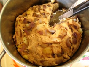 Kurz nach 12.00 Uhr verabschiedete sie sich und wir begannen den Tisch – äh den Boden zu decken. Ich holte den Gratin aus dem Ofen, legte das Schöpfbesteck bereit und schon wollten wir loslegen. Deckel weg und – ups? Ist das wirklich Kartoffelgratin? Sieht eher aus wie ein Katoffel- und Zwiebelbrot! Da muss wohl oder übel ein Messer her, damit sich jeder eine Scheibe abschneiden konnte. Leider war das ganze ziemlich teigig und wegen der vielen ganzen Nägeli nicht so einfach geniessbar.